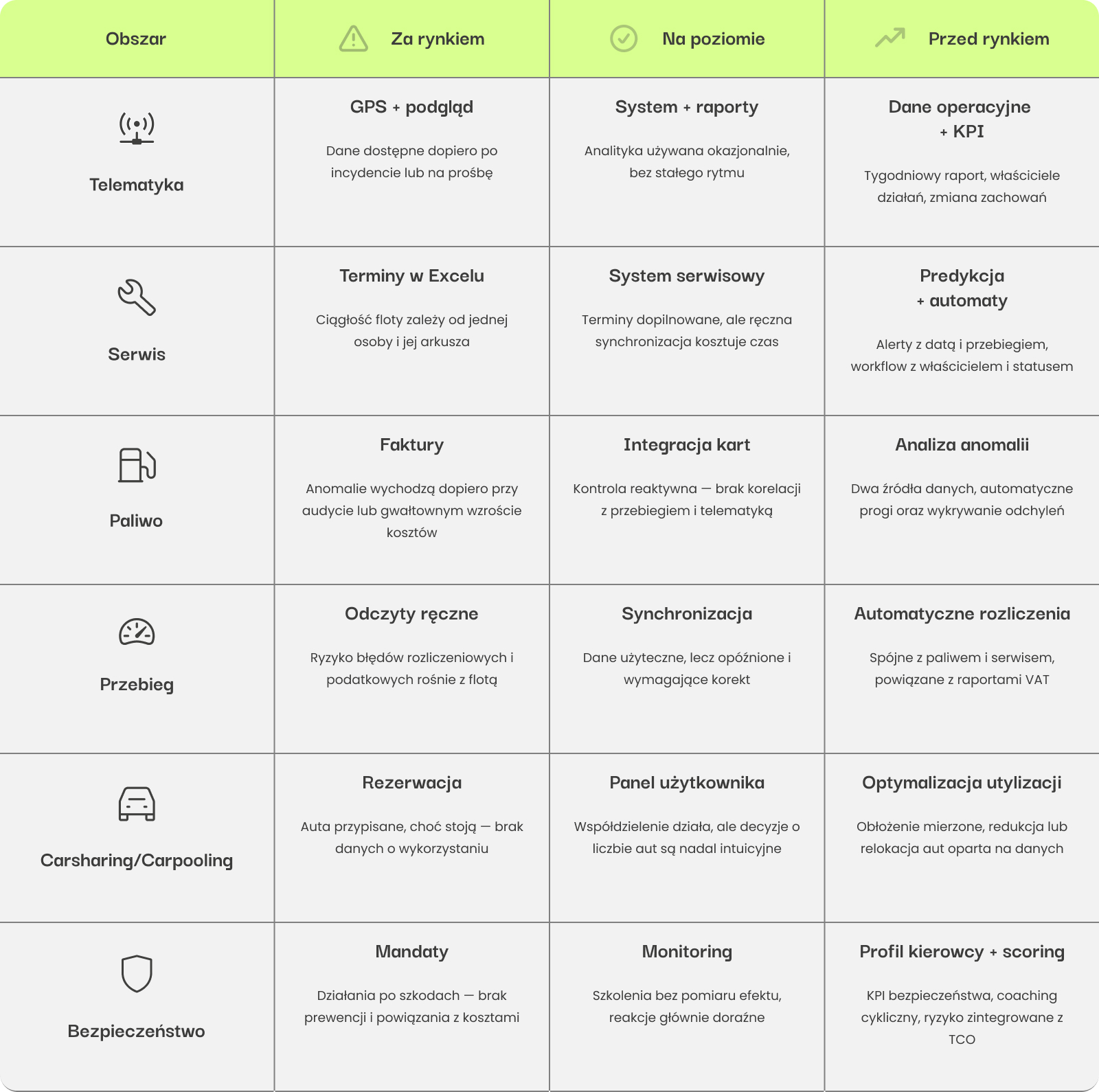 W praktyce organizacje, które przechodzą tę drogę, osiągają poziom operacyjnej „normalności” charakterystyczny dla standardu flotowego lat 2026–2027: