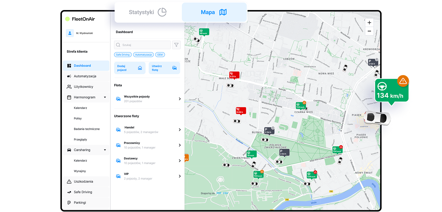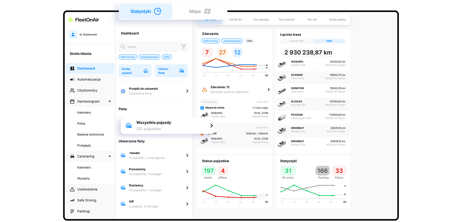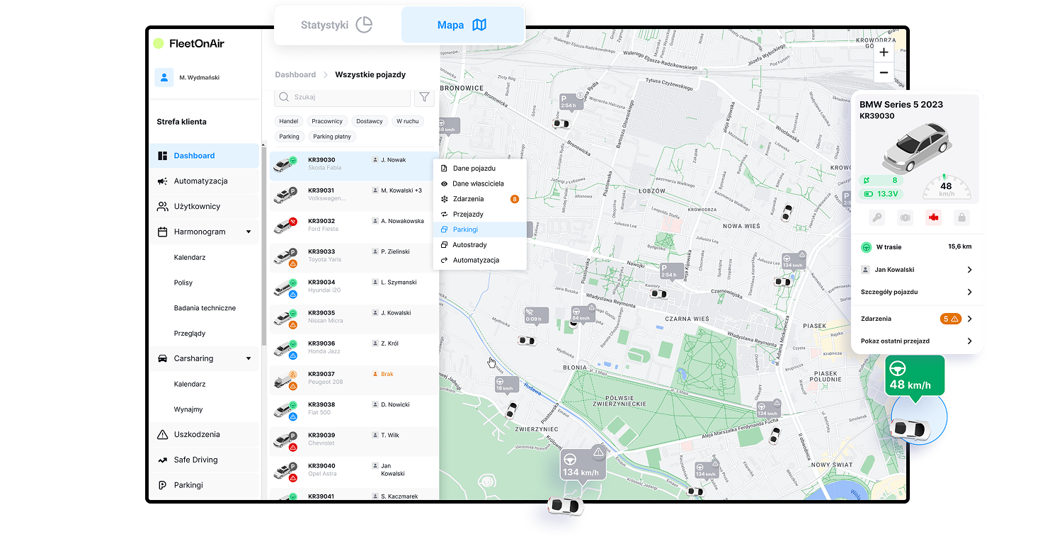 System FleetOnAir działa 24/7, a lokalizacja aktualizuje się na bieżąco. Menedżer floty na platformie widzi, gdzie znajdują się pojazdy GPS, jakie mają prędkości, jaki jest przebieg i którędy prowadzą trasy. W aplikacji można przeglądać najważniejszych danych dla dowolnego okresu: od pojedynczego kursu po pełny raport miesięczny. To wspiera wydajność, efektywność i zarządzanie zasobami w skali całej floty i maszyn pracujących w terenie, także na całym świecie.