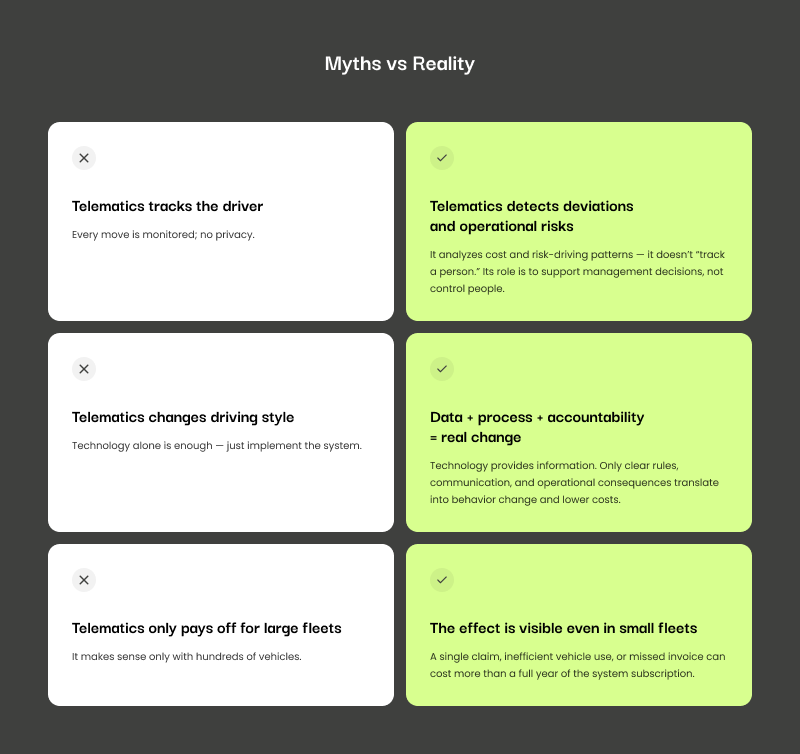 Fleet telematics has an unclear status today: on one hand, fleet telematics is treated as an “obvious standard,” while on the other it still creates resistance, emotions, and many misunderstandings. In practice, telematics systems are neither a tool for “tracking people” nor a magic lever that fixes fuel costs and operational costs on its own. Fleet telematics systems are primarily a data infrastructure that supports fleet management in safety, compliance, and fleet operations. Real operational efficiency, meaningful reduce costs outcomes, and daily predictability appear only when telematics solutions are connected to processes and fleet policy. If not, telematics data often ends up as charts in a dashboard, without changing decisions.