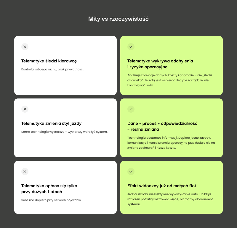 W tym artykule obalamy trzy mity, pokazujemy praktyczne scenariusze i wyjaśniamy, co daje telematyka floty w rzeczywistych warunkach. Wnioski są proste: rozwiązania telematyczne mają największą wartość wtedy, gdy „wpadają” w proces, a nie wtedy, gdy kończą jako wykresy w systemie.