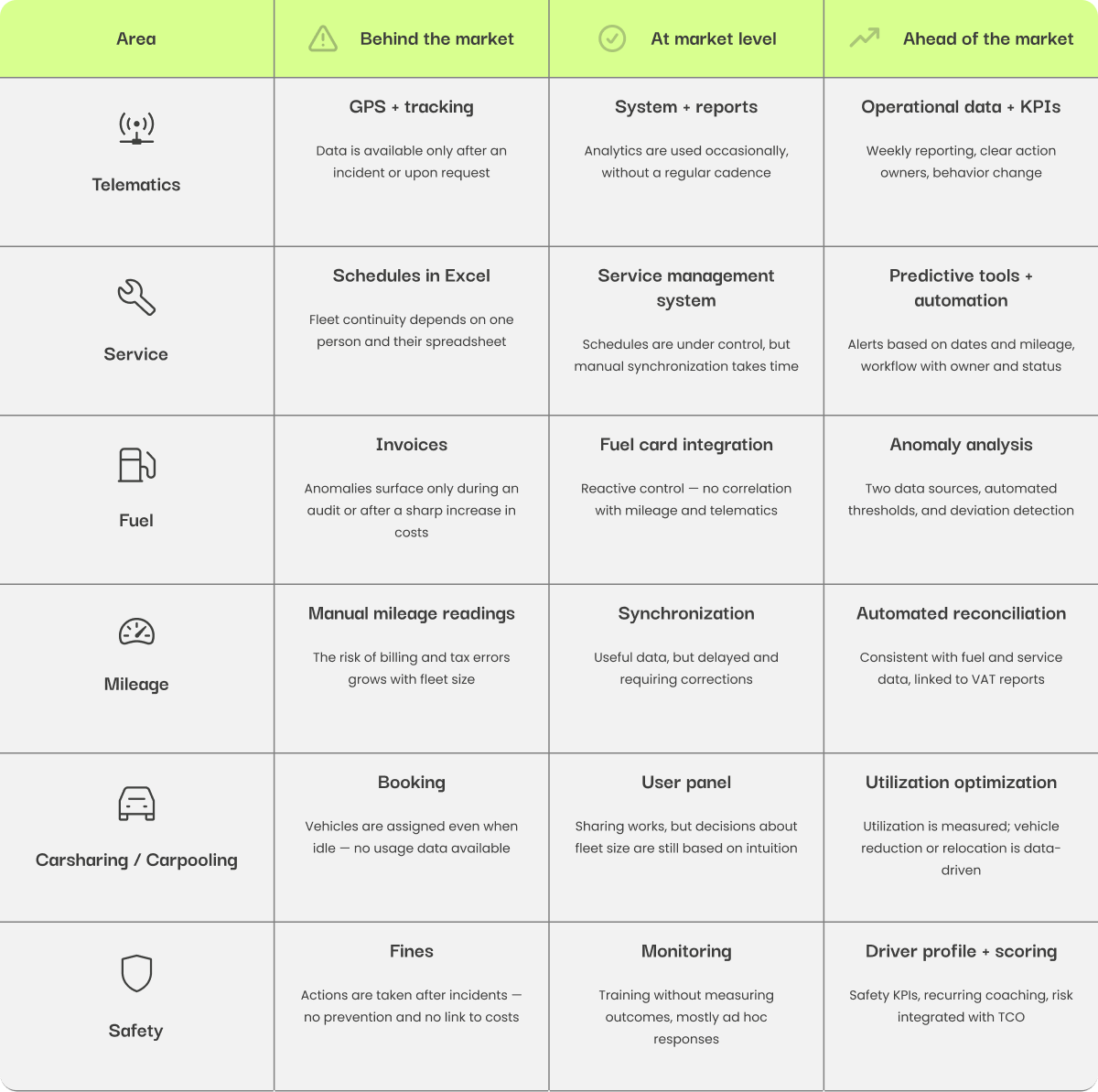 The following fleet maturity benchmark is a comparative reference for 2026–2027. It is not a ranking, nor an attempt to judge any organization. Its purpose is to allow you to compare your fleet management practices against market-level standards across six areas and to identify the single most important development step worth taking first.