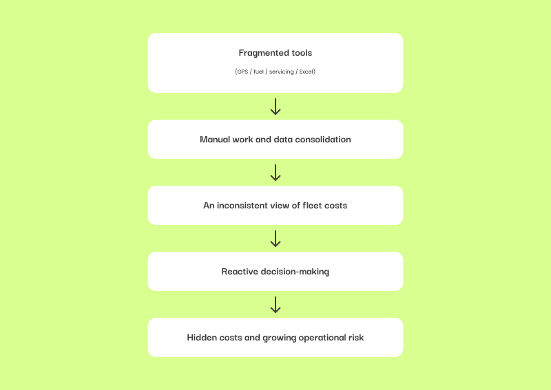 Fleet management rarely loses control abruptly. In most cases, efficiency deteriorates gradually. The fleet slowly expands while processes fail to keep pace with its growth. Processes fragment across tools, manual work increases, and data loses its coherence. Decisions are made in reaction to incidents rather than on the basis of a steady reporting rhythm. In this model, costs and risks accumulate quietly, and operational predictability comes to depend almost entirely on the experience of individual people.